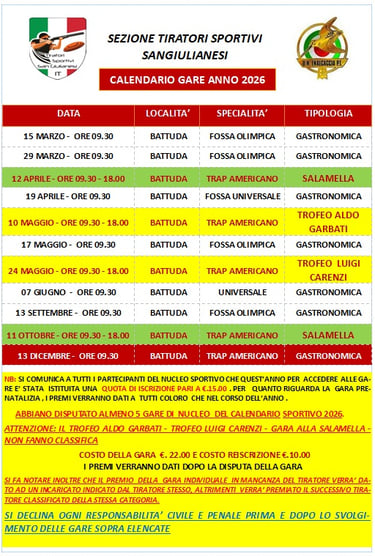 Il sodalizio e lieto di comunicare le date delle gare per l'anno 2026